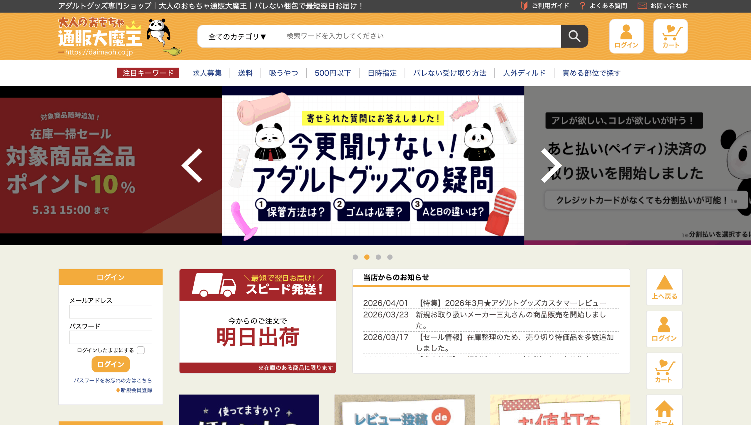 大人のおもちゃ通販大魔王は、品揃えや比較のしやすさを重視する人向けの定番候補です。迷ったときに最初に見ておきたいサイトとしておすすめできます。